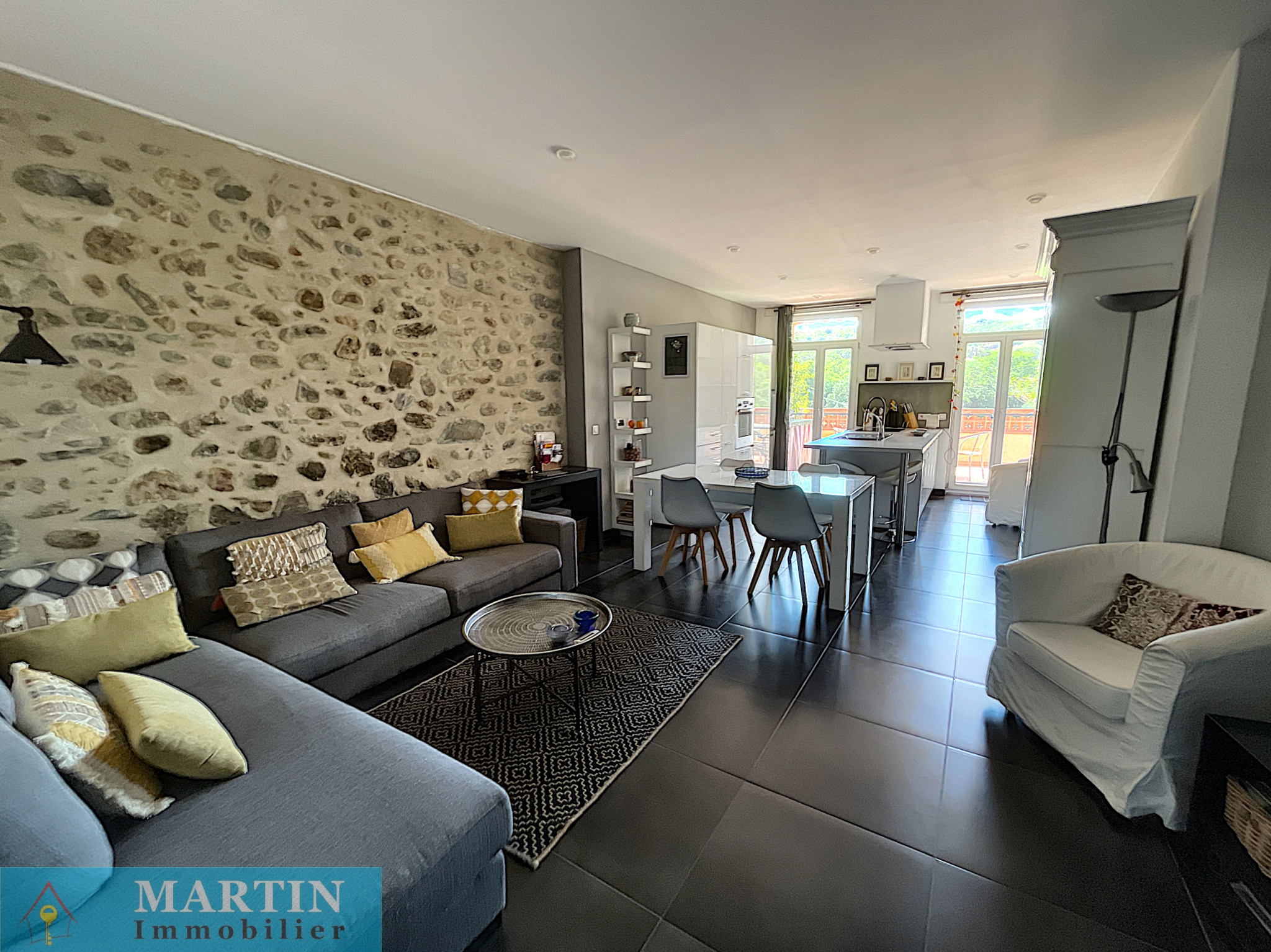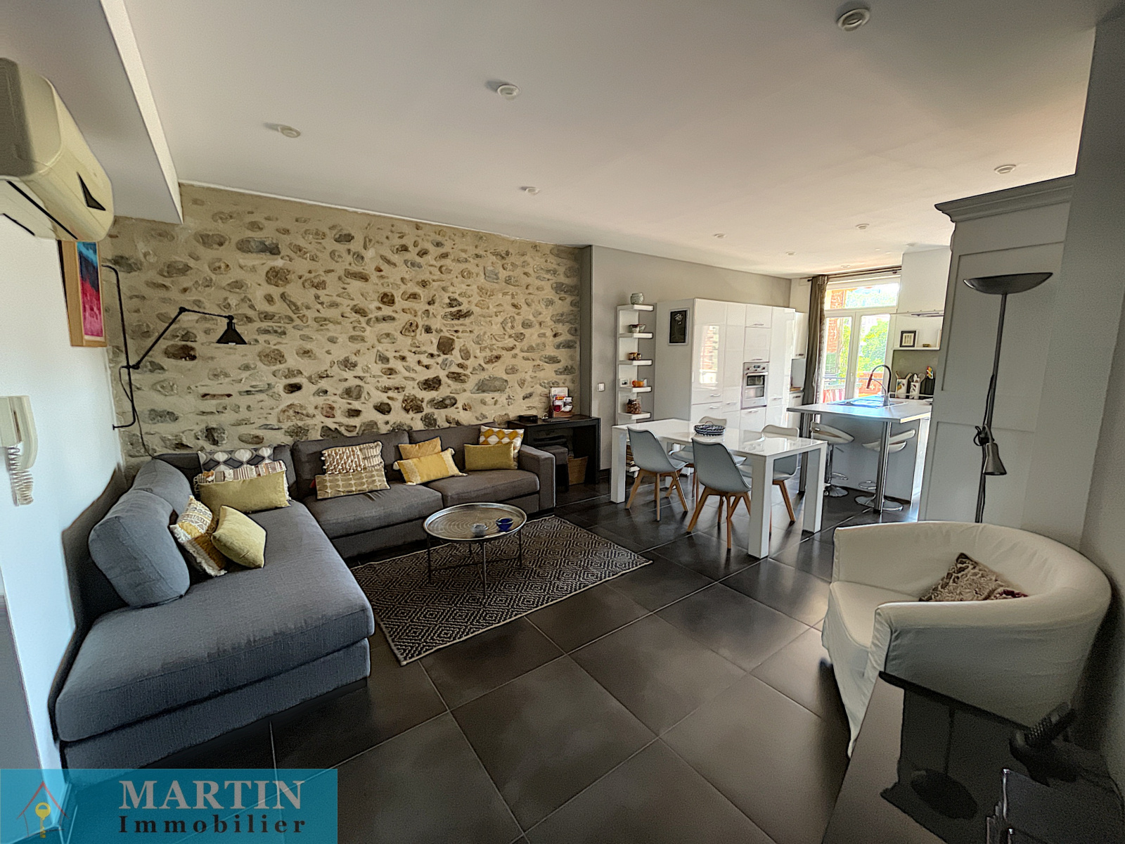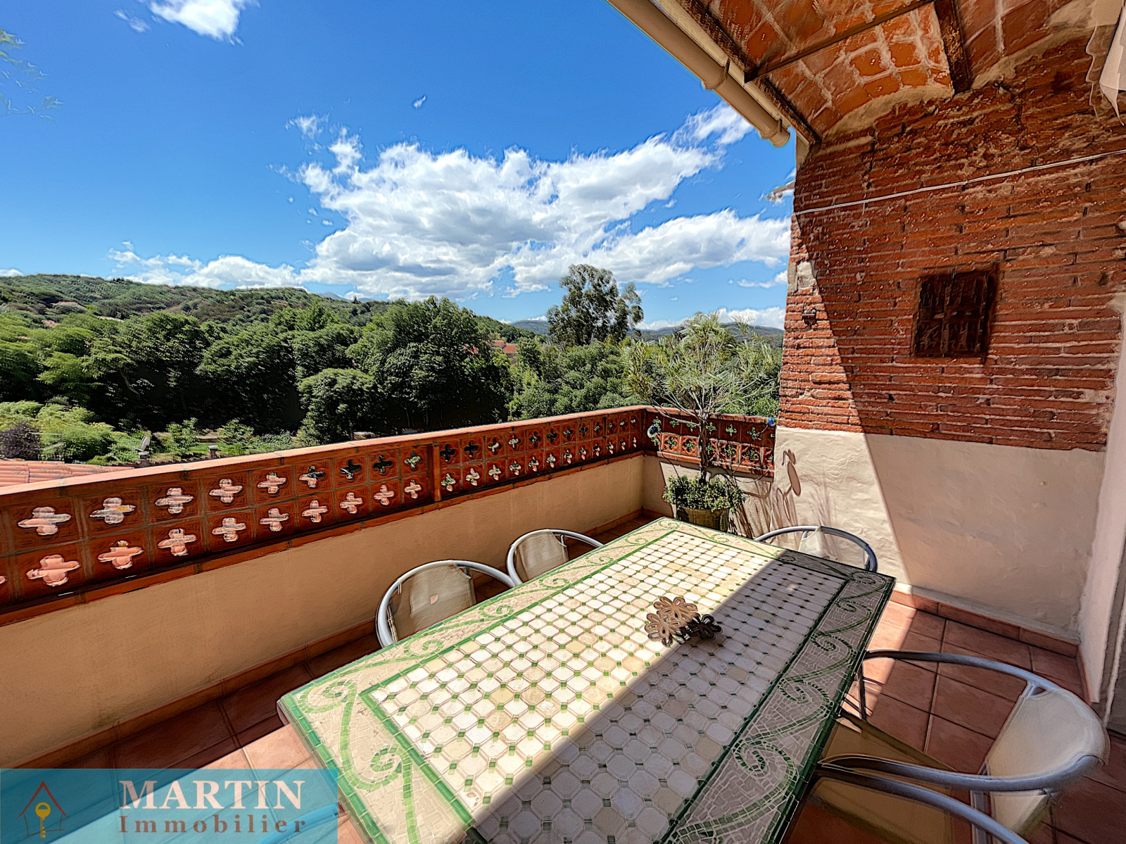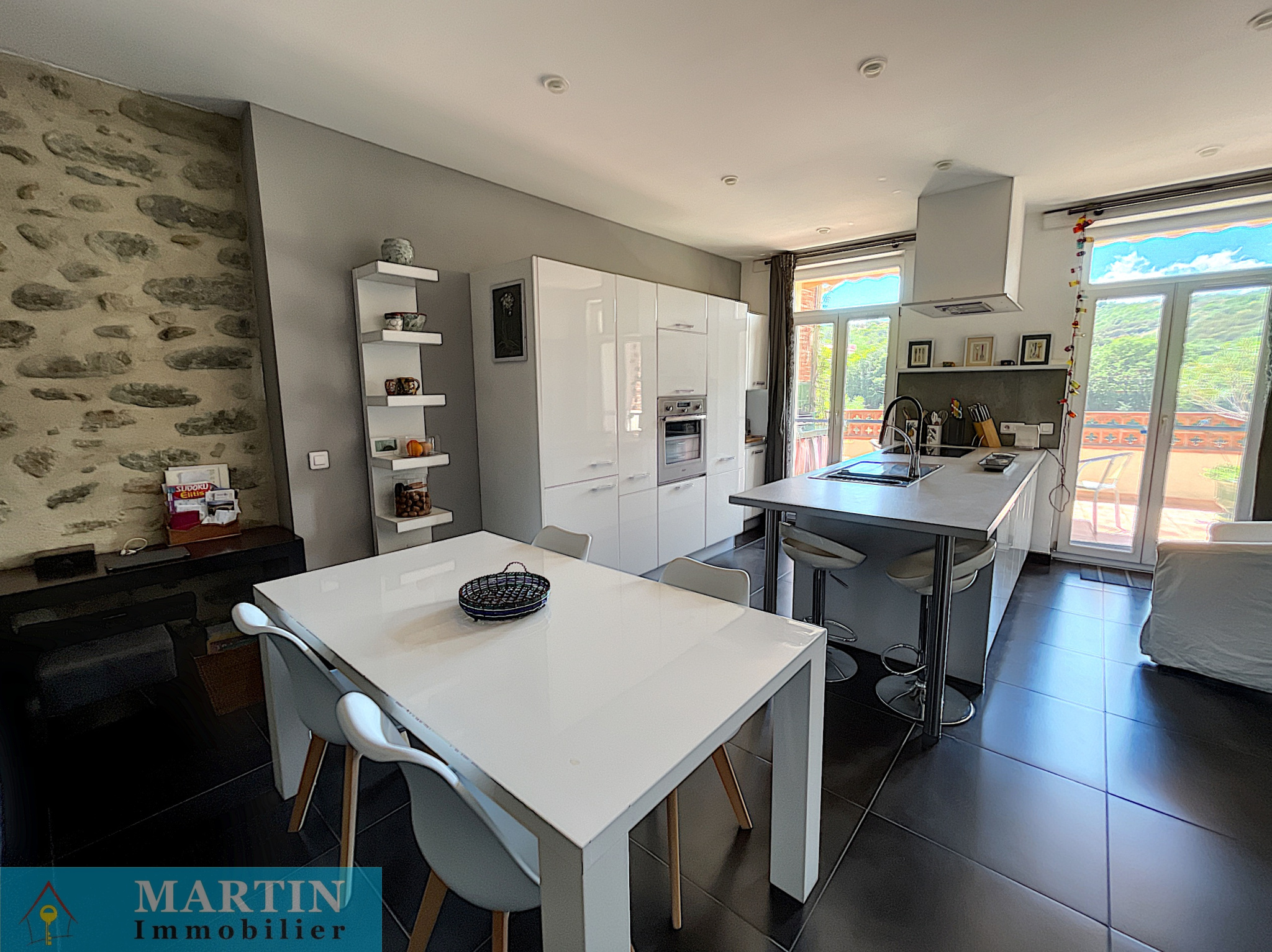 Coup de coeur ! dans petite copropriété de deux lots sans charges, superbe appartement Duplex Haut de gamme d'environ 93.17 m² en plein coeur de Céret composé au rdc d'un grand garage, porte automatique, chambre, salle d'eau douche italienne, wc suspendu, magnifique cour au calme et ensoleillée. A l'étage grand salon cuisine ouverte sur très belle terrasse Sud-Ouest, vue dégagée. Deux chambres exposition Est dont une avec dressing, salle d'eau, WC. Climatisation réversible, double vitrage, matériaux nobles, beaucoup de cachet !