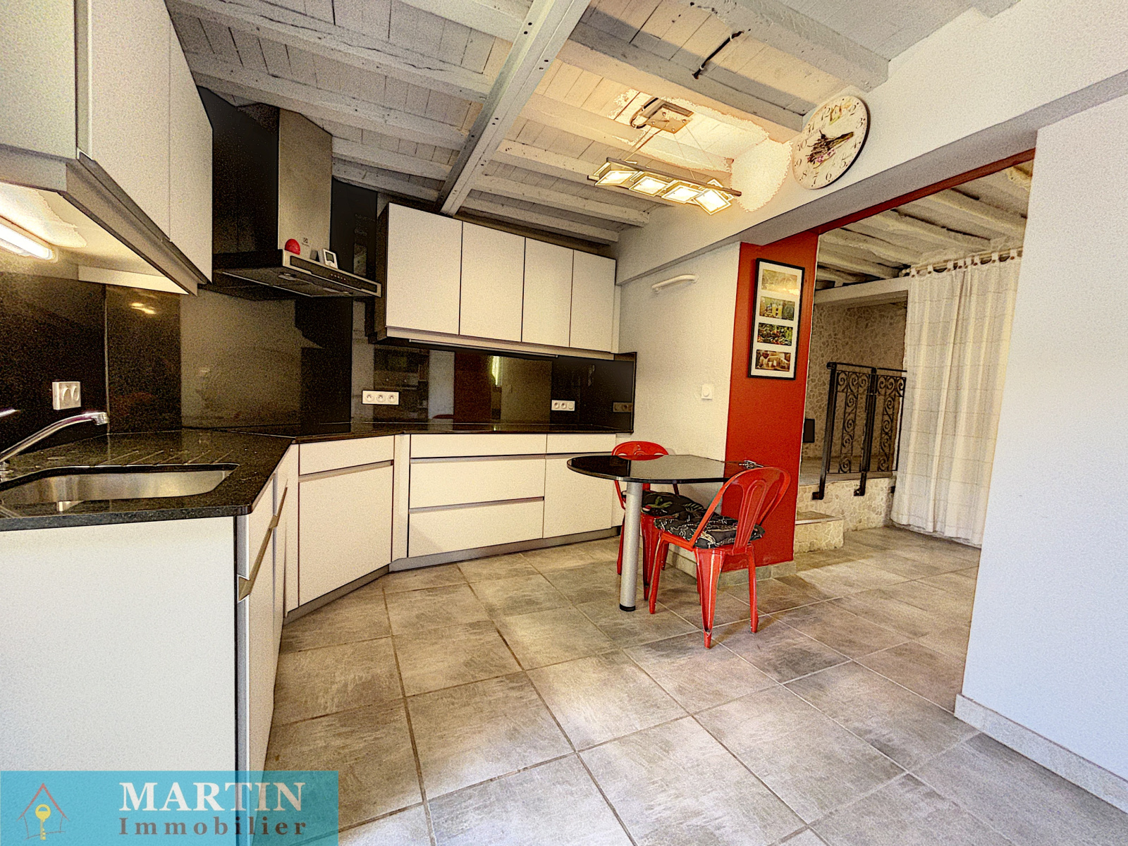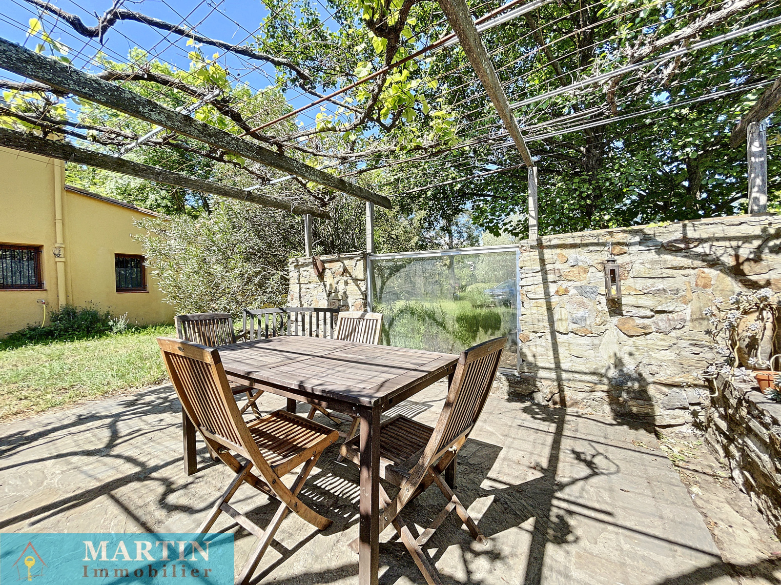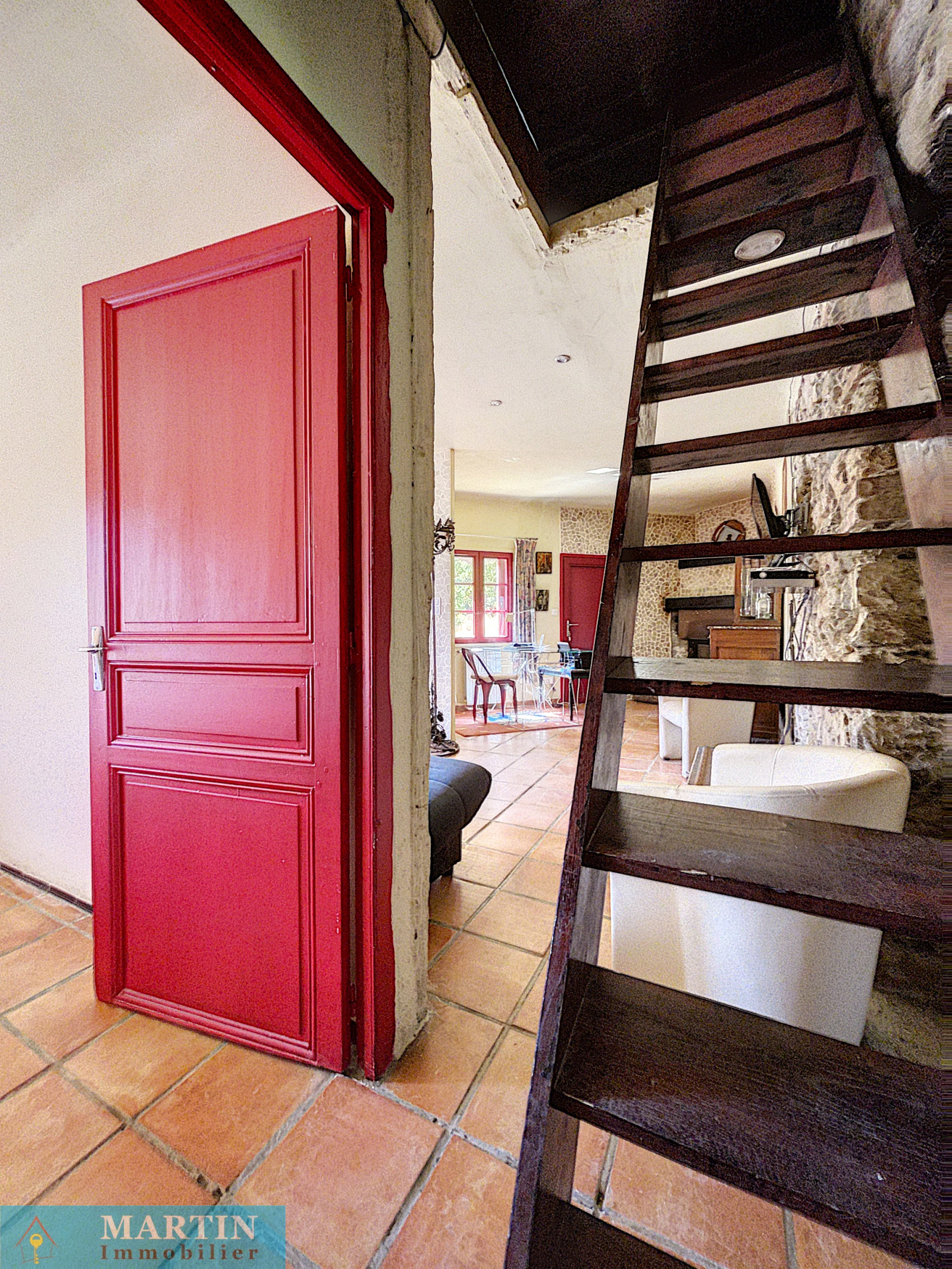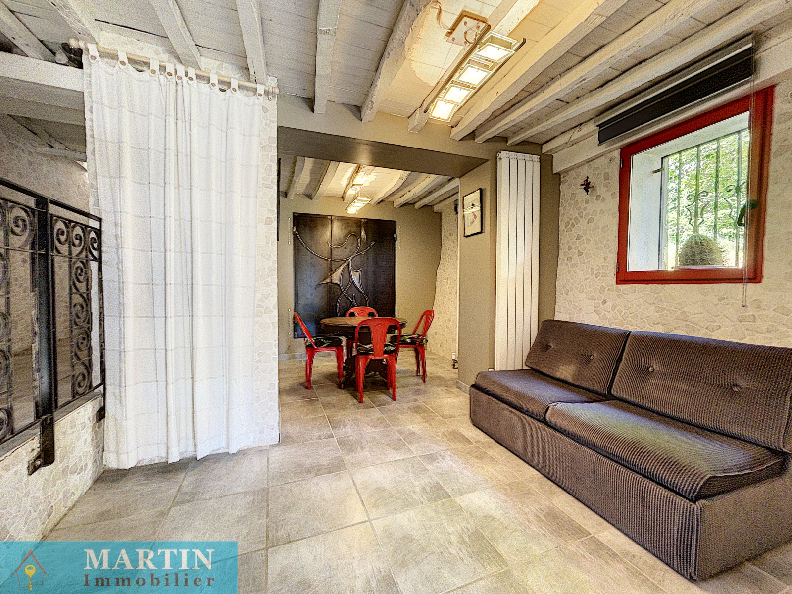 Elle est composée en rez de jardin d'une salle à manger avec cuisine ouverte donnant sur une très agréable terrasse, une salle d'eau avec buanderie et wc, un bureau pouvant servir de chambre d'appoint.
