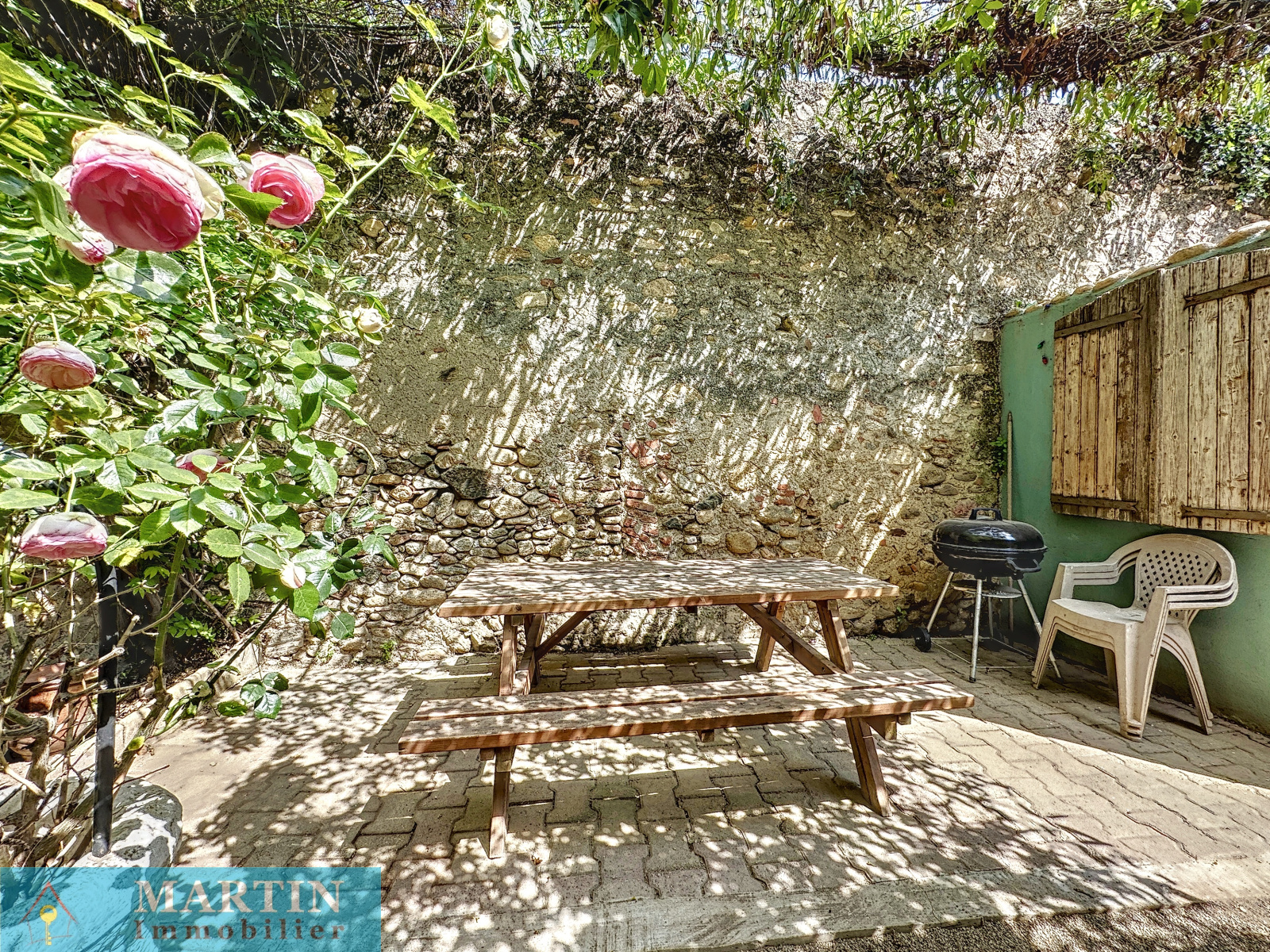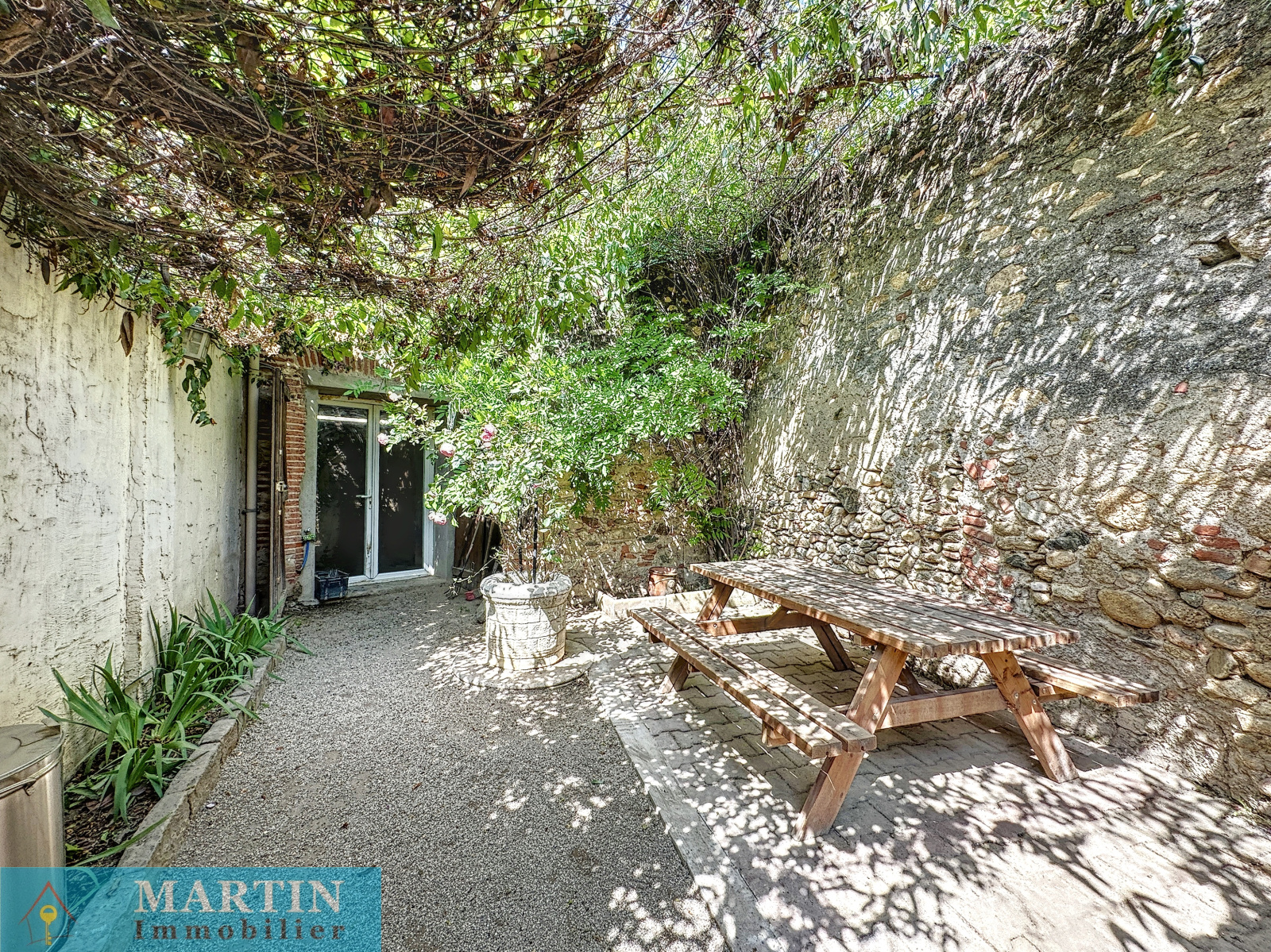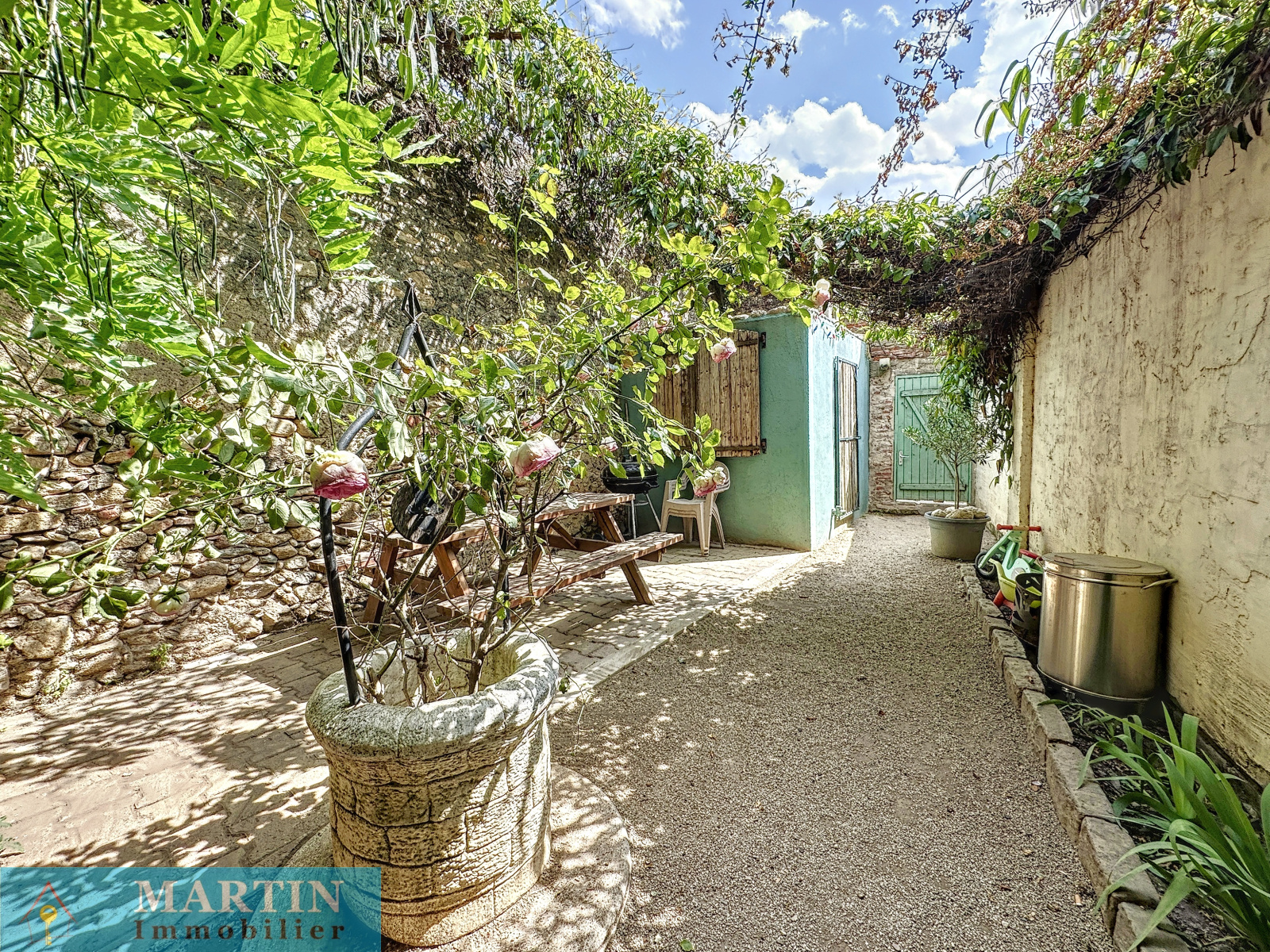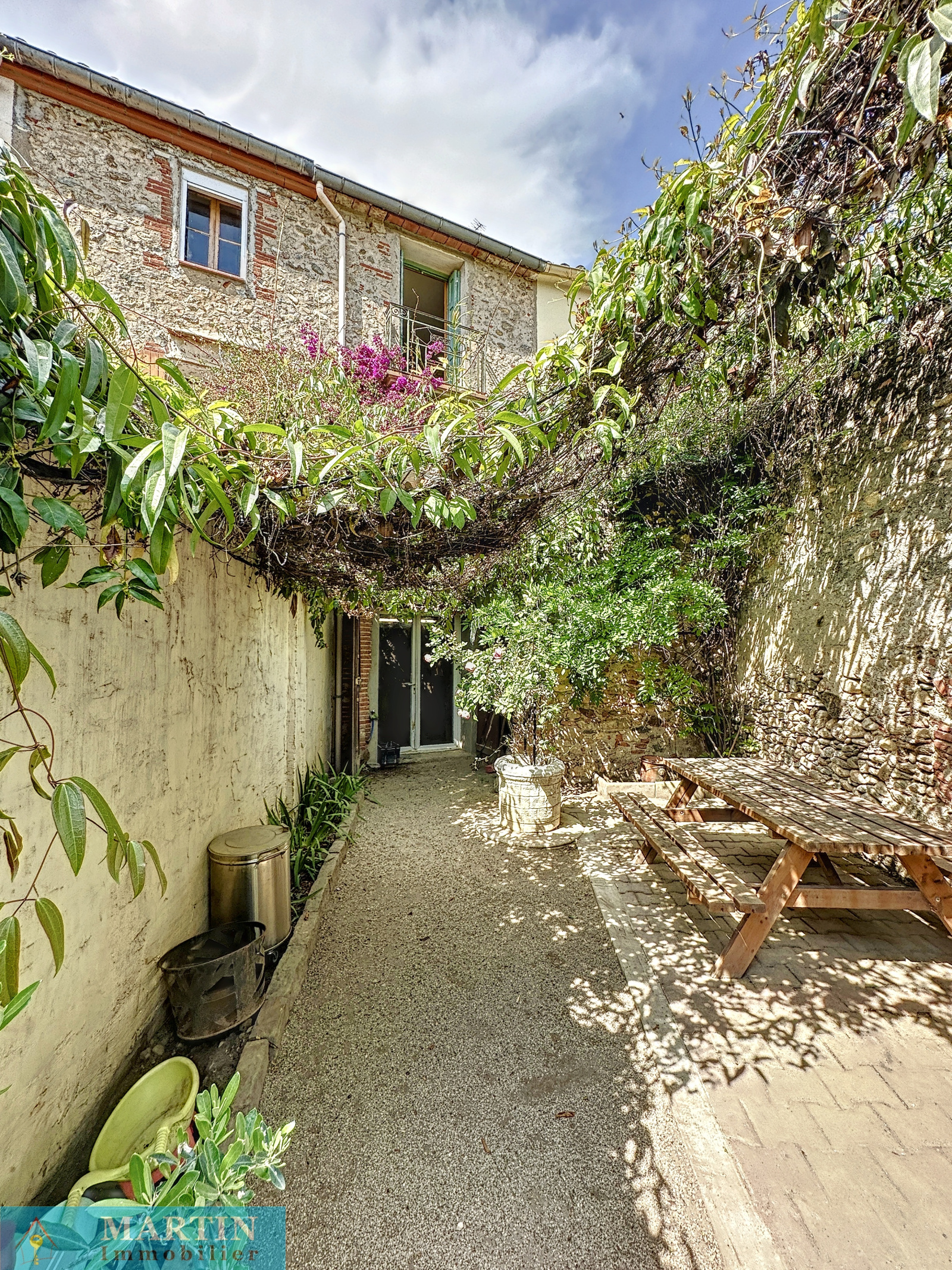 Charmante maison de village traversante avec jardin composée en rez-de-chaussée d'un garage (pas d'accès voiture) / buanderie, WC et accès sur le jardin avec dépendances dont une cuisine d'été et une terrasse abritée d'environ 10,60 m². A l'étage un salon avec balcon et une cuisine rénovée équipée. Au 2ème étage 2 chambres avec balcon et une salle d'eau / WC. Exposition plein sud. Quelques travaux et finitions à prévoir. Double vitrage. Une belle vue dégagée. Canal d'arrosage. Surfaces utiles d'environ 112m². Surface de terrain 338m². Double vitrage.