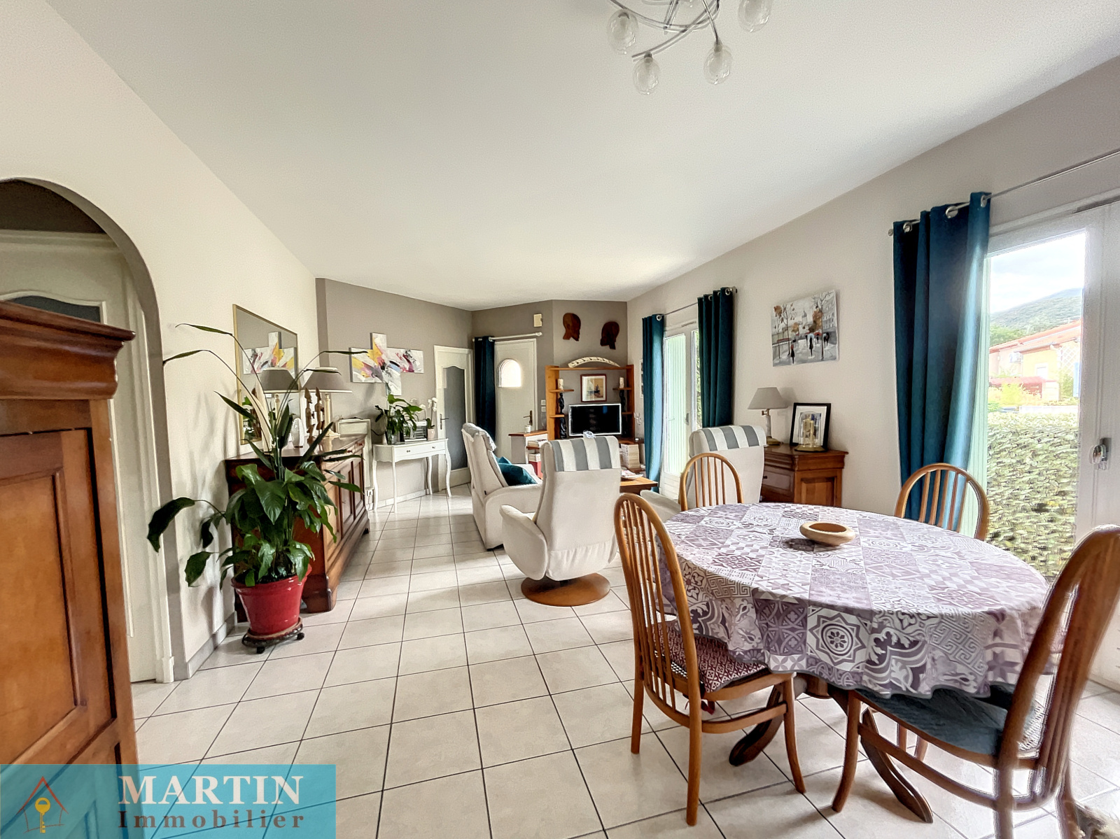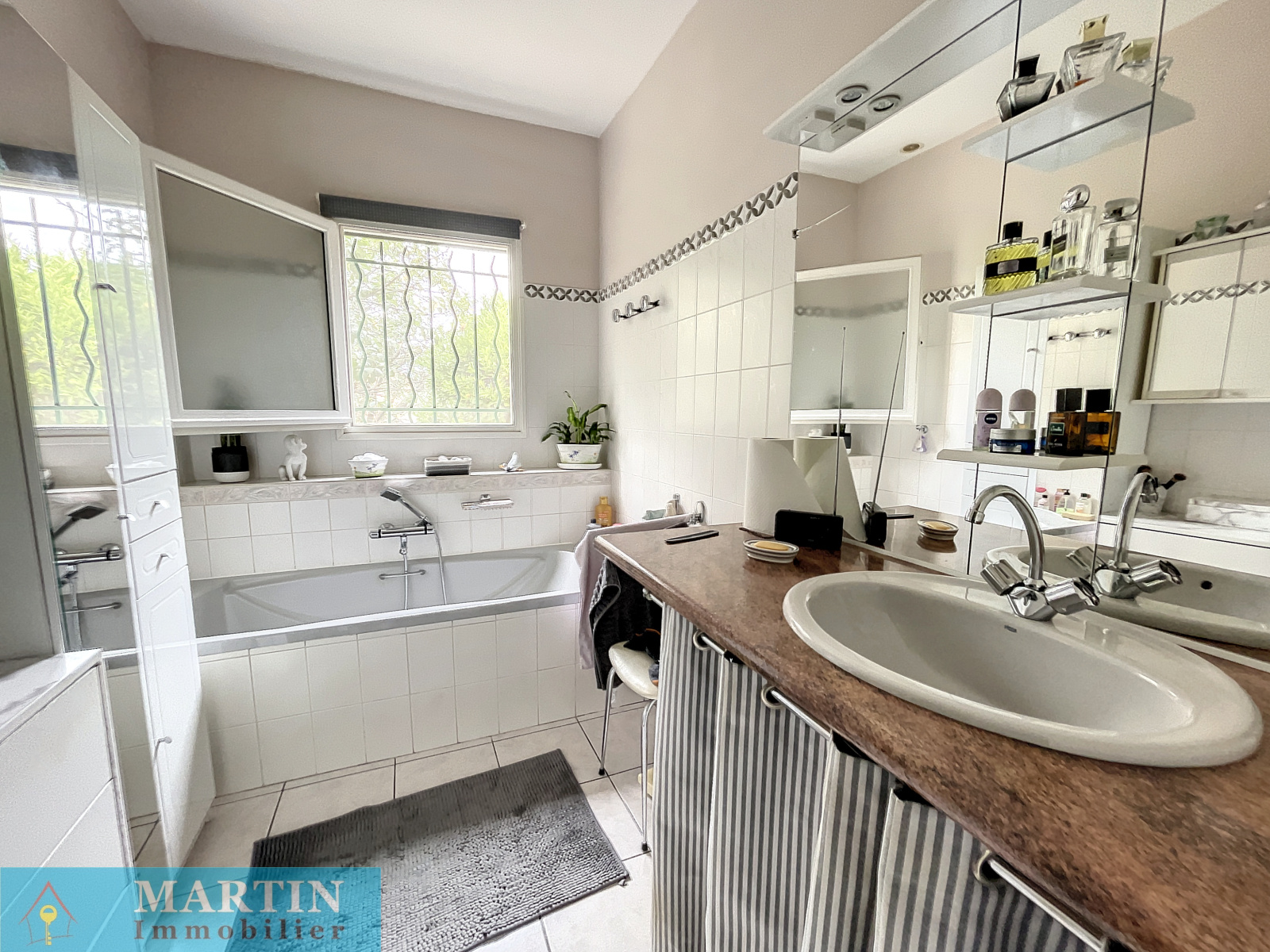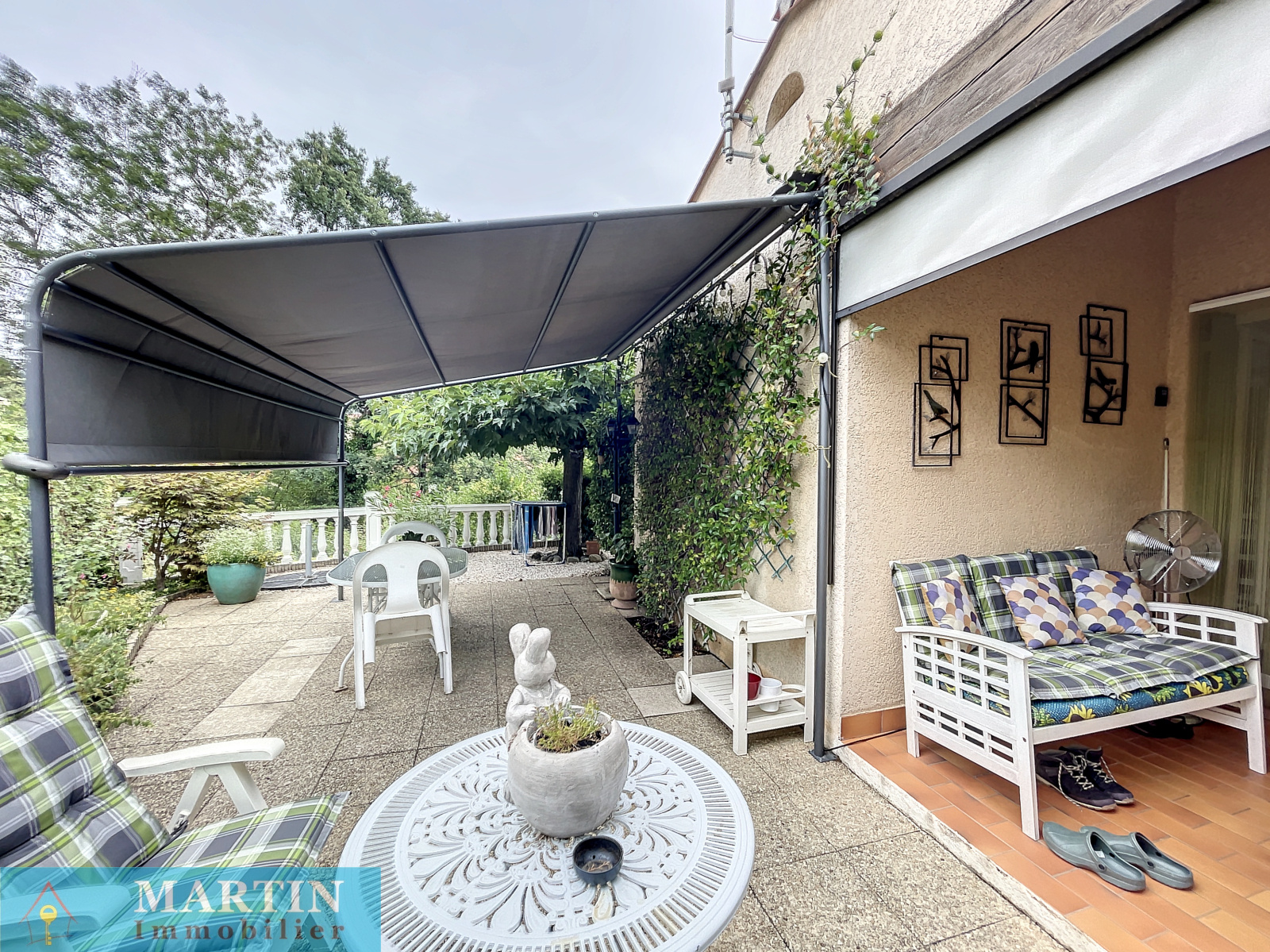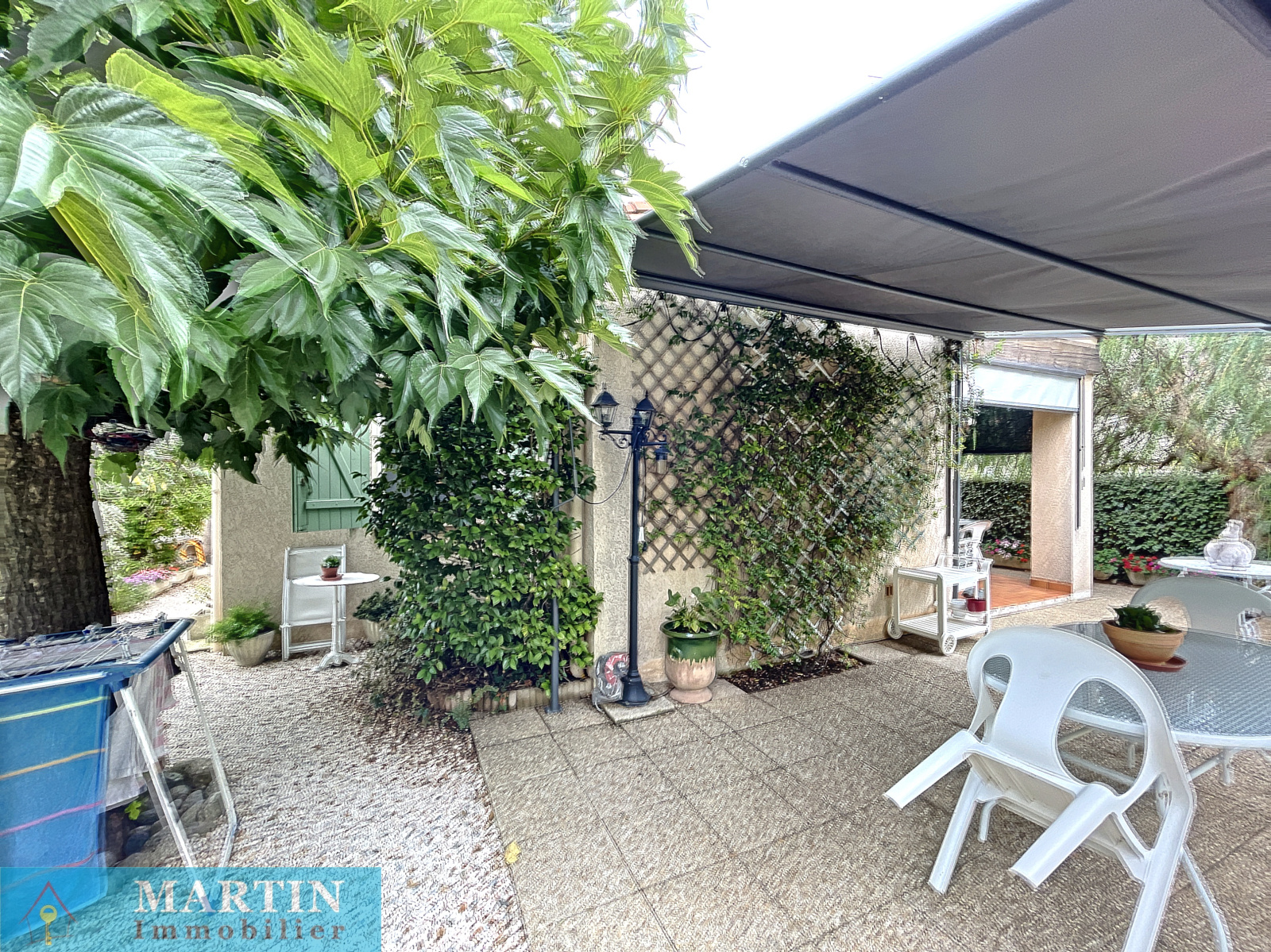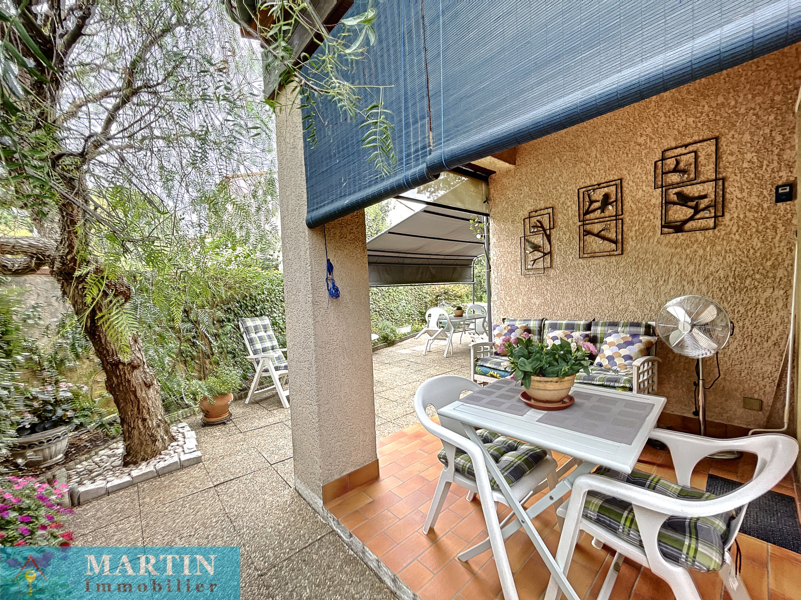 A deux pas de commerces et commodités, Une charmante villa de plain-pied en trois faces (mitoyenne par le garage) sur un terrain arboré de 547m². La villa dispose d'une cuisine ouverte sur le séjour et une terrasse couverte, deux chambres, salle de bain, WC et garage d'environ 24.82 avec mezzanine. Double vitrage. Moustiquaires. Pergola. Beau jardin. Vue dégagée. Canal d'arrosage. A visiter rapidement !