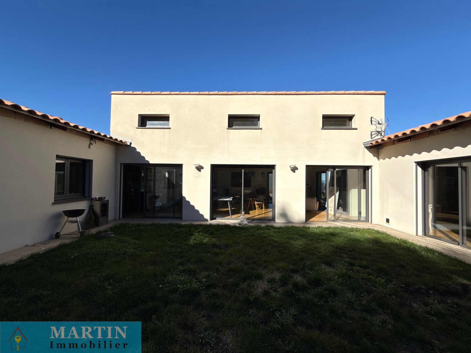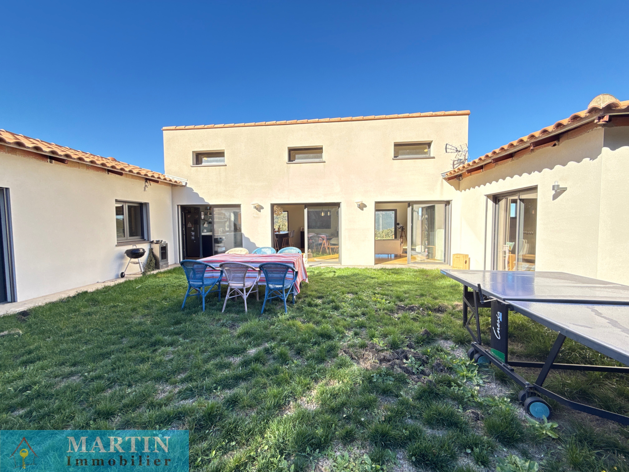L’intérieur se compose d’un séjour spacieux et lumineux avec une cuisine américaine ouverte, idéal pour recevoir. La villa comprend trois chambres, dont une grande suite parentale avec salle de bains, WC et dressing attenants. Un espace bureau, une buanderie et une salle d’eau avec WC complètent cette belle maison. Le bureau peut également être transformé en chambre selon vos besoins.