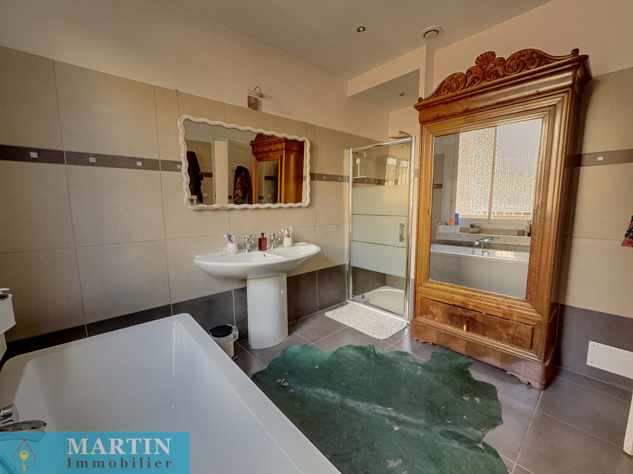 Elle dispose également d’un extérieur avec une entrée de 90m² avec piscine de 3.65m par 2m, barbecue couvert, un grand garage de 150m² au sol sur 2.5 niveaux avec pierres apparentes et un préau avec un étage aménageable.