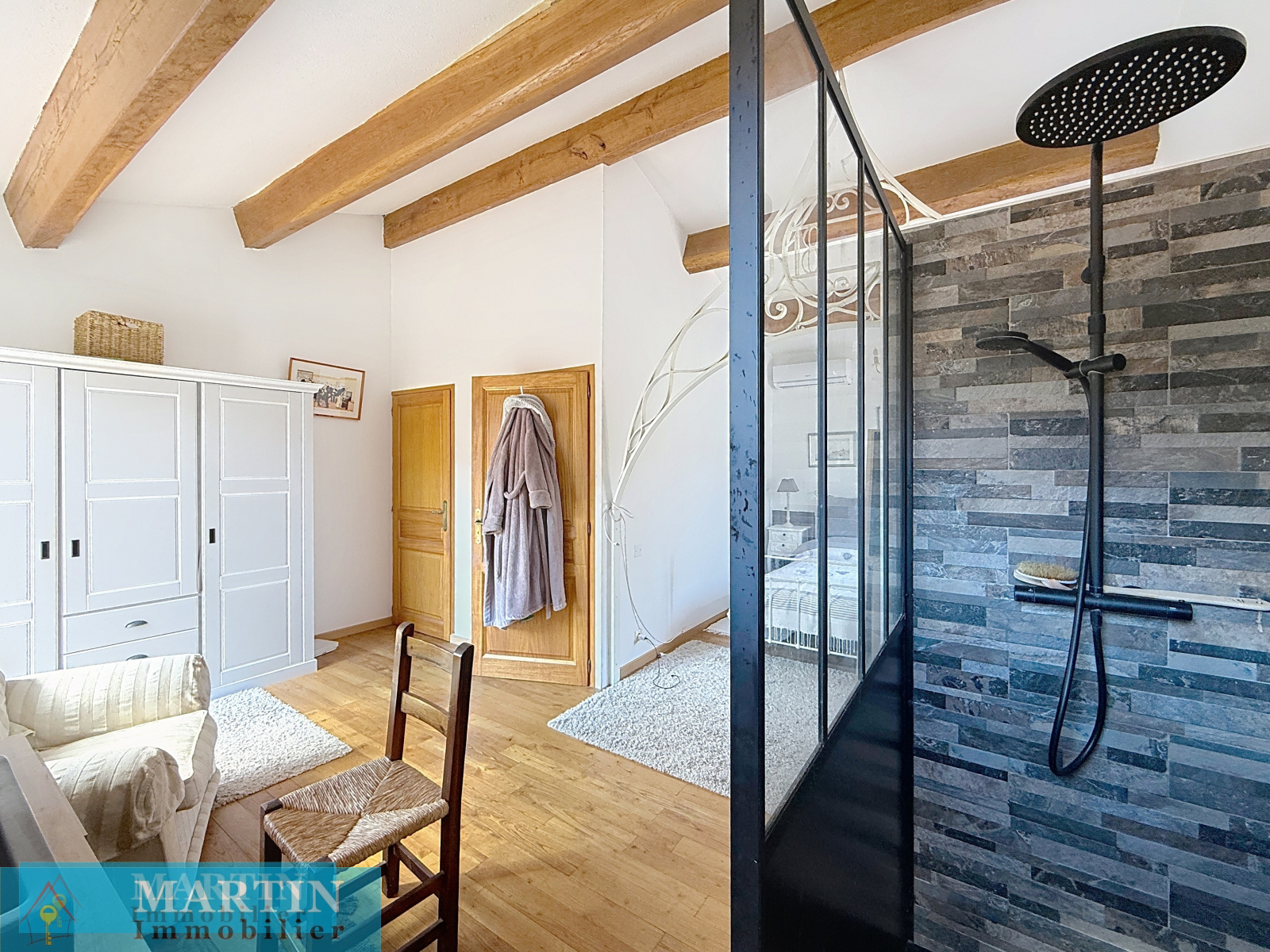 Située dans un quartier résidentiel au calme, jolie maison atypique non-mitoyenne, 4 pièces avec piscine et garage, composée d'un séjour d'environ 48 m² avec une cheminée avec insert et donnant sur une belle terrasse ensoleillée, une cuisine, une entrée, un WC et une salle d'eau. A l'étage 3 chambres dont une suite parentale d'environ 25 m² avec sa salle d'eau, WC et balcon. À l'extérieur, la piscine sera le point de rendez-vous parfait pour se rafraîchir durant les chaudes journées d'été. Le terrain paysagé de 4661,5 m² en palier contribue à l'esthétique de l'ensemble, tout en offrant un coin de verdure agréable. Un cabanon en bois est également présent pour le rangement des outils ou du matériel de jardin. De plus, cette maison est équipée d'un système d'arrosage goutte-à-goutte. La climatisation réversible et le chauffage central au gaz garantissent un confort optimal en toutes saisons. Enfin, le portail motorisé ajoute une touche de praticité et de sécurité.