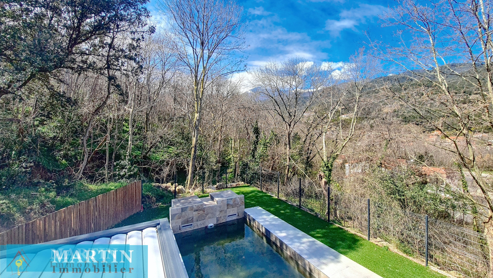 Piscine maçonnée 9 m x 4 m au sel avec volet de couverture motorisé.
